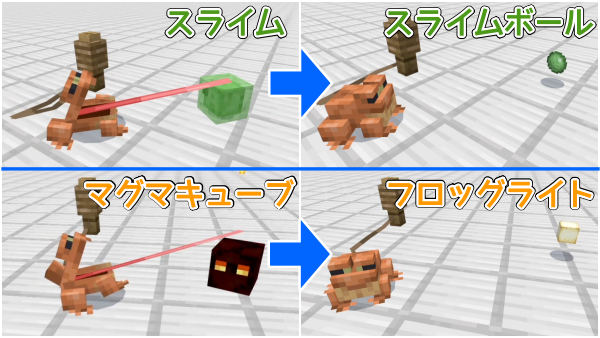 友好モブなのでプレイヤーには攻撃しませんが、小さいスライムやマグマキューブを捕食し、スライムボールや新しく追加されたフロッグライトをドロップします