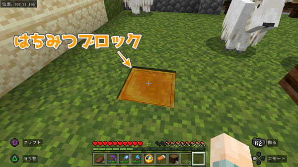 ちなみに、このヤギ牧場はヤギがジャンプして脱走しないように地面をはちみつブロック+こけブロックにしてるんですよね