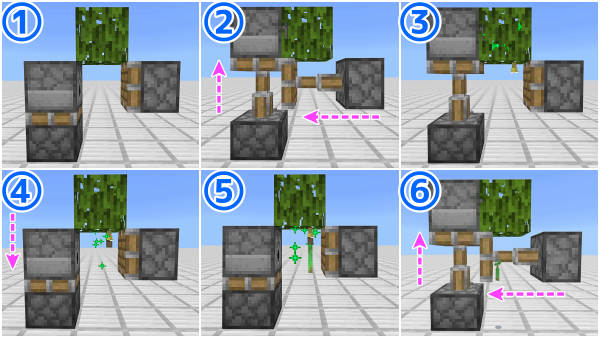 クロック回路の信号をそのままピストンに繋げると、ピストンが出しっぱなしになって葉の下にむかごが生成されないので、すぐ戻るように観察者を使って一瞬の信号に変換しています