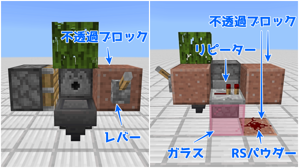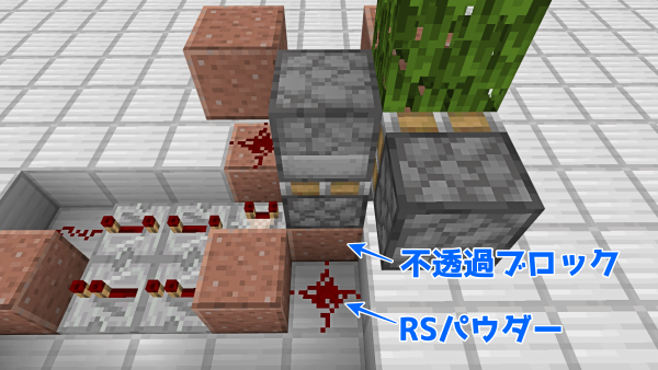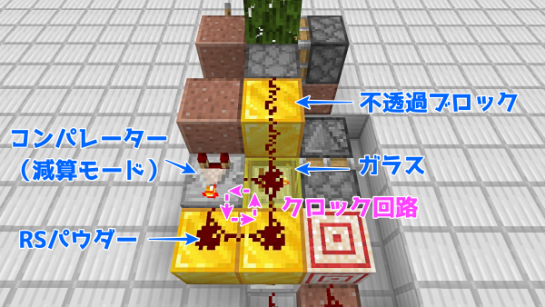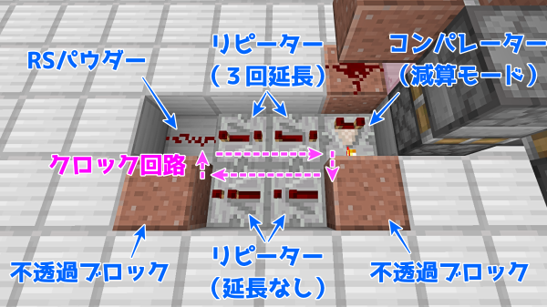 コンパレーターを点灯させて減算モードにすることと、リピーターの向きと延長回数に注意です