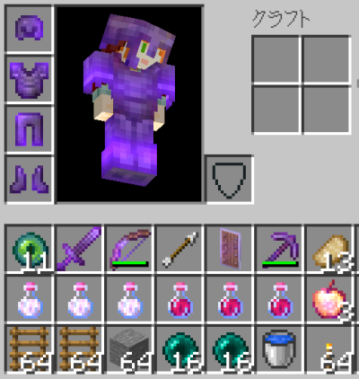 ちなみに、くり抜かれたカボチャを被ったり透明化のポーションを飲んだりするとエンダーマンと目が合いませんが、前者は視界が悪すぎますし、後者は効果を最大限得るためには防具を脱ぐ必要があるので却下です