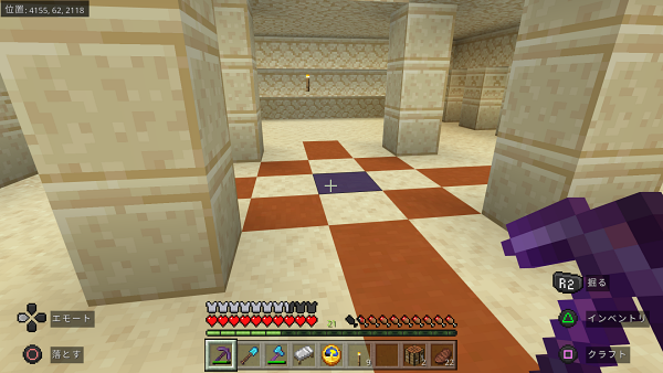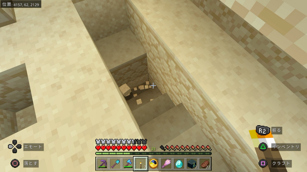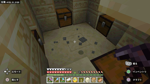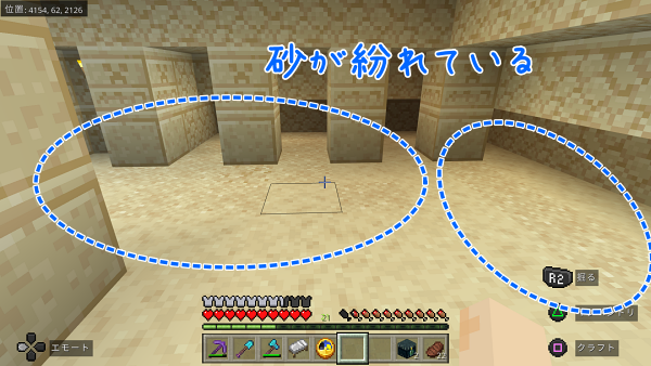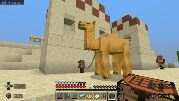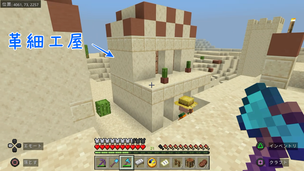 どうやら、他のバイオームの村の革細工屋にはチェストがあって中にサドルが入っている可能性があるのですが、唯一砂漠の村だけチェストがないらしい…