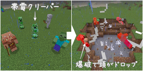 手に入れるには帯電クリーパーの爆破にこれらのモブを巻き込まなければいけません(※スケルトンの頭は古代都市で手にいれる方法もあります)