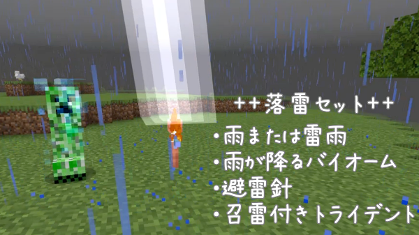 昔は雷雨になるのを待って偶然クリーパーに落雷するのを願うしかなかったのですが、今は雨天時に雨の降るバイオームで避雷針に召雷付きトライデントを当てれば任意の場所に落雷させることができます