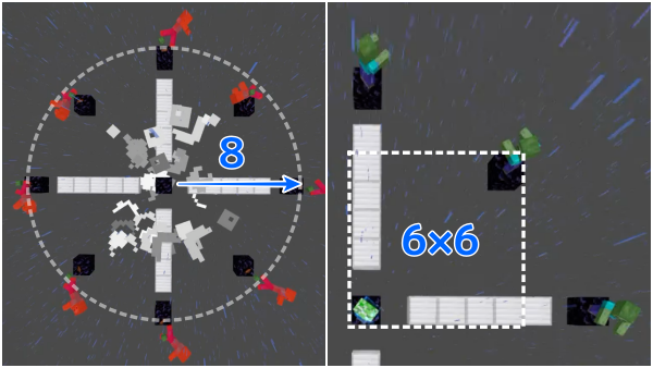 帯電クリーパーの爆破によってモブヘッドがドロップする範囲は、帯電クリーパーを中心に半径8ブロックの球型になるので、6×6ブロック以内の囲いを作れば大丈夫かなと思います